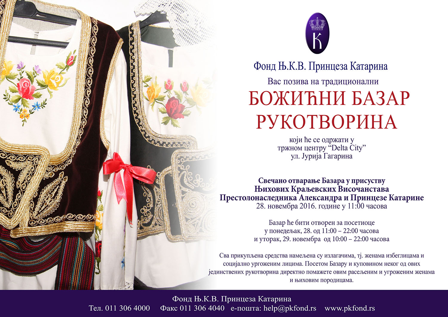 Njihova Kraljevska Visočanstva Prestolonaslednik Aleksandar i Princeza Katarina otvoriće tradicionalni božićni bazar rukotvorina u ponedeljak, 28. novembra u 11 časova u tržnom centru Delta city. Otvaranju humanitarnog bazara prisustvovaće i Dr Nenad Ivanišević, državni sekretar u Ministarstvu za rad, zapošljavanje, boračka i socijalna pitanja, g-din Vladimir Cucić, komesar Komesarijata za […]